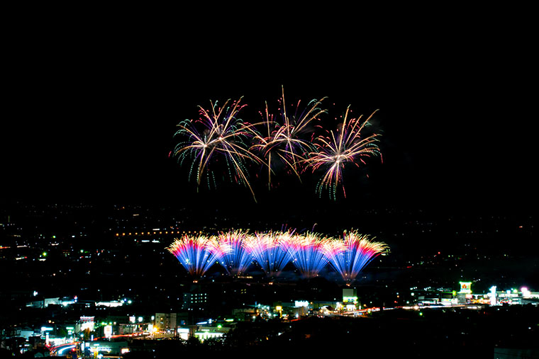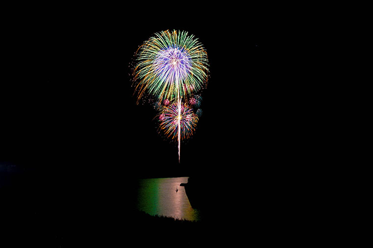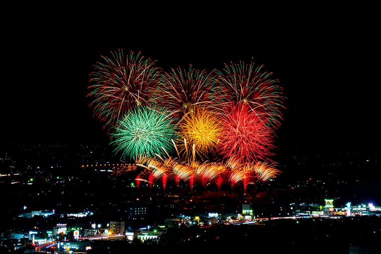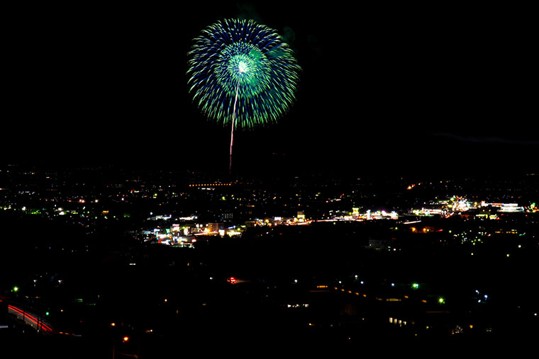花火大会の全体を伝えたい場合には、俯瞰したような構図になると思います。